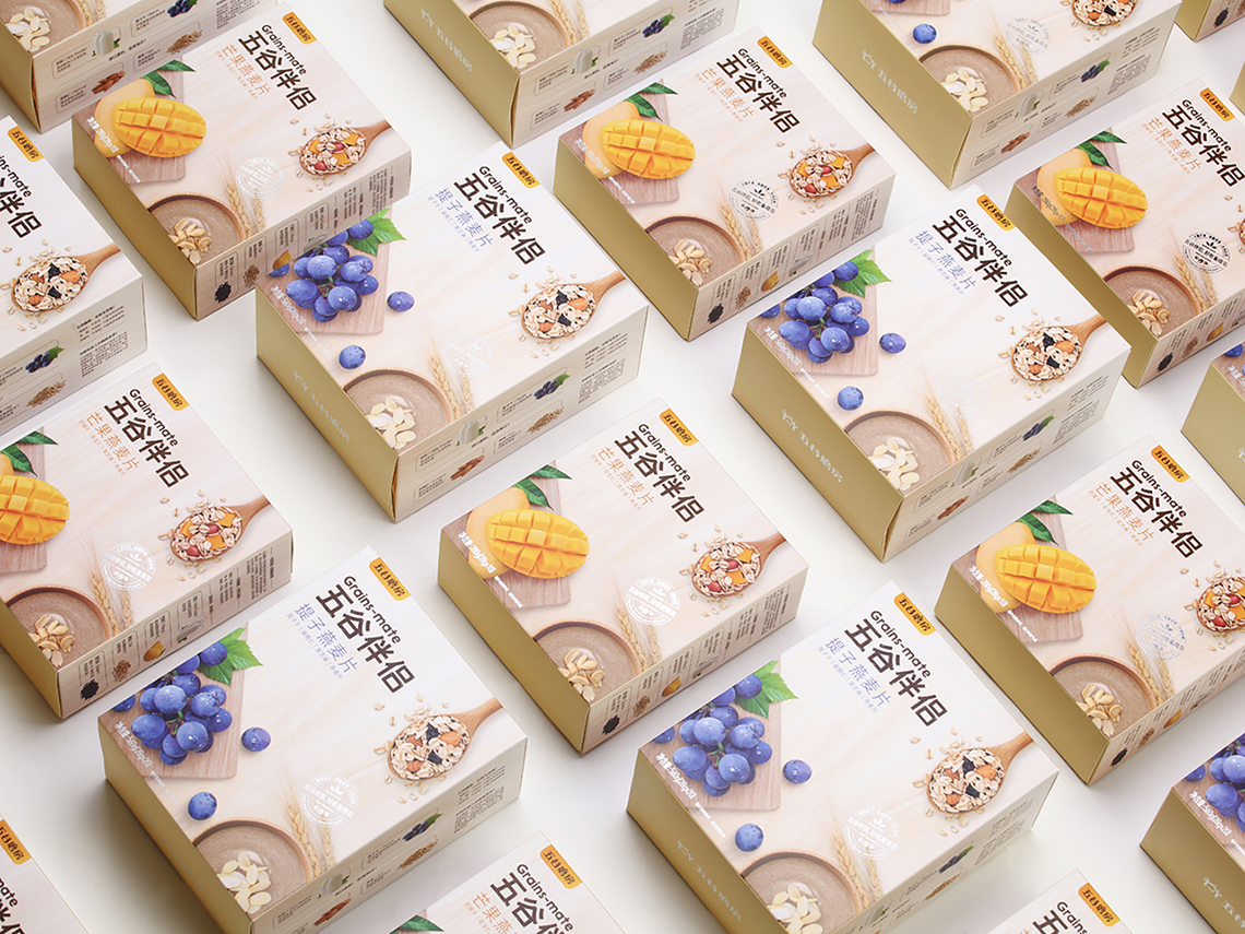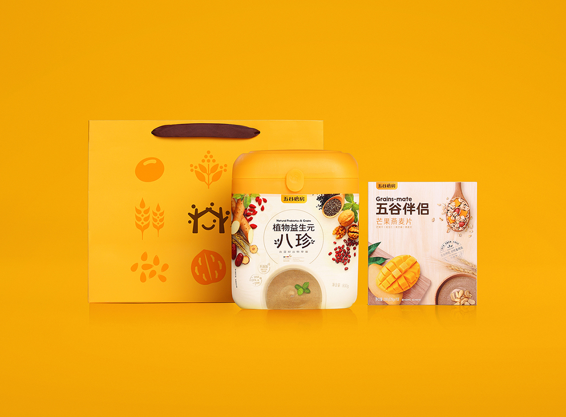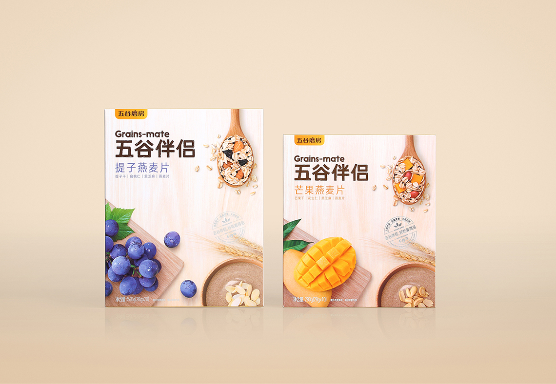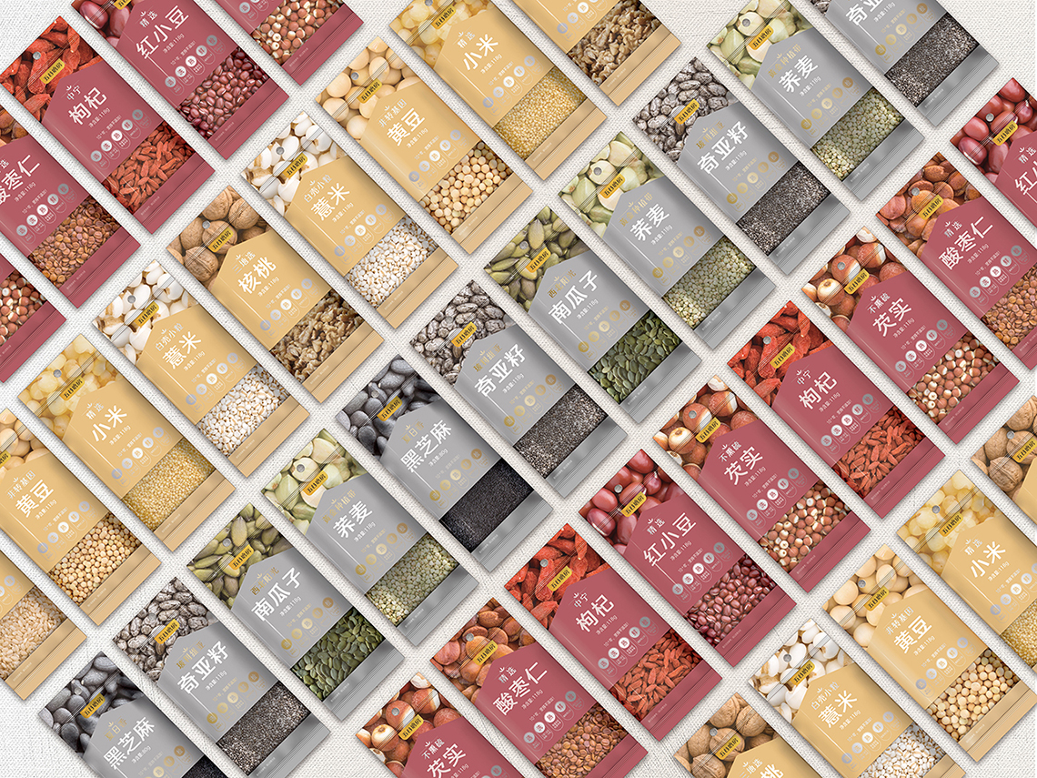 “五谷伴侶”作為搭配食用產(chǎn)品,設(shè)計思路以展現(xiàn)“原料新鮮健康、口感豐富美味”為主,通過增強整個系列的食欲感來提升消費者購買量。在視覺表現(xiàn)上,形成固定的構(gòu)圖屬式,整體包裝風(fēng)格延續(xù)益元八珍清新自然的風(fēng)格。