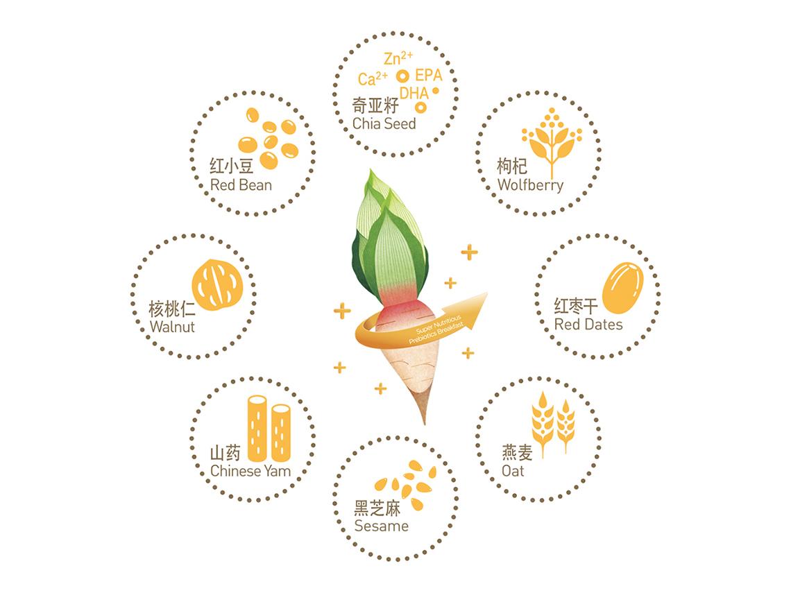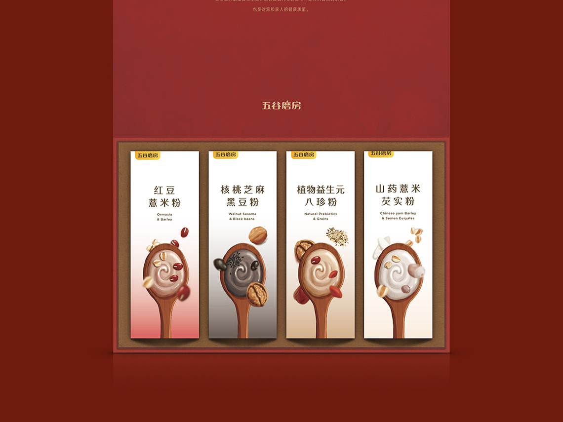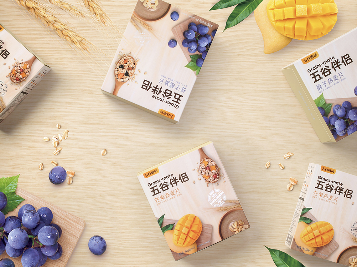 “五谷伴侶”作為搭配食用產(chǎn)品,設(shè)計思路以展現(xiàn)“原料新鮮健康、口感豐富美味”為主,通過增強整個系列的食欲感來提升消費者購買量。在視覺表現(xiàn)上,形成固定的構(gòu)圖屬式,整體包裝風(fēng)格延續(xù)益元八珍清新自然的風(fēng)格。