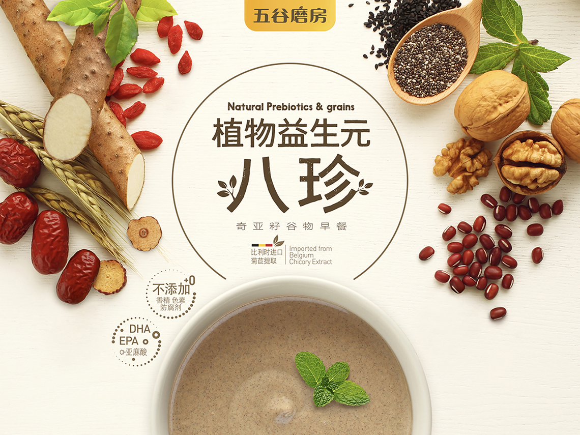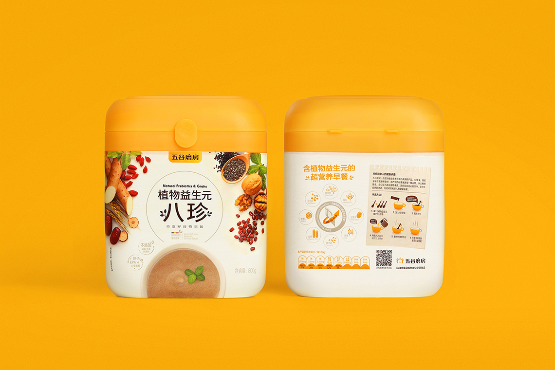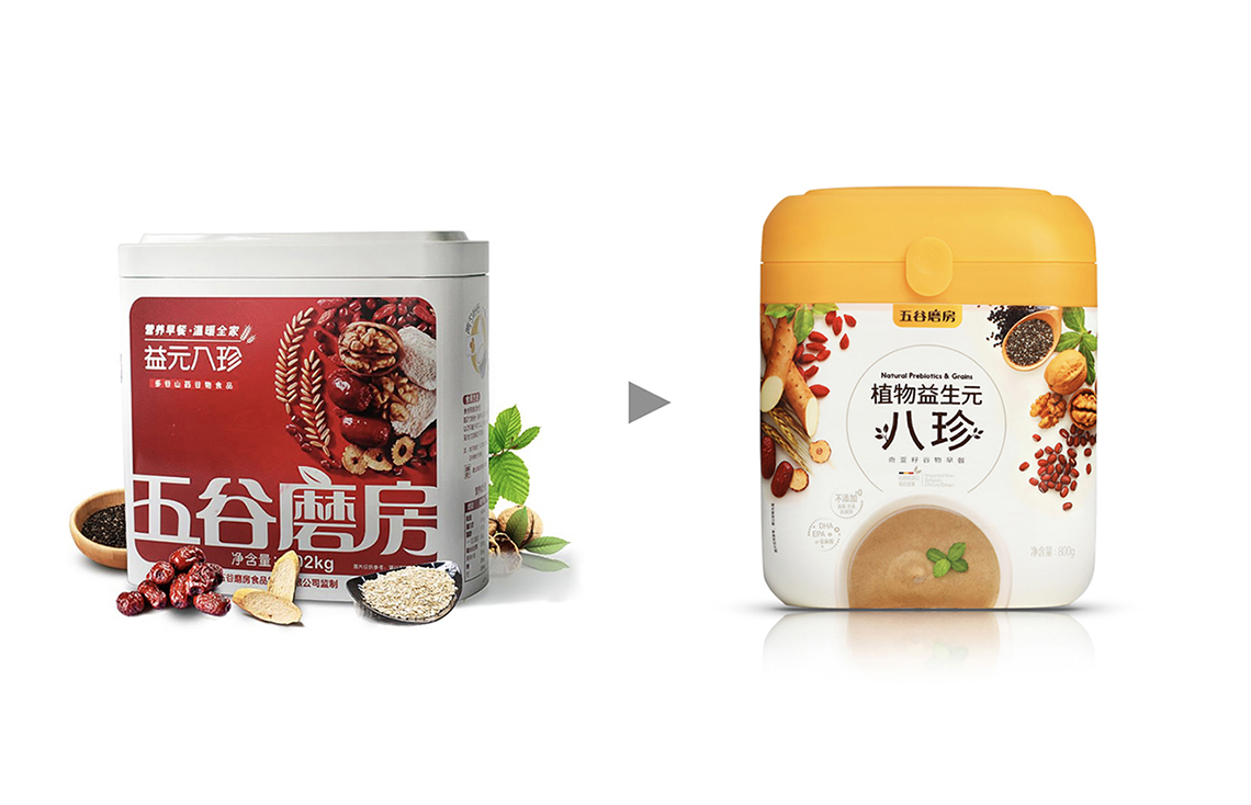 隨著品牌形象的更新,五谷磨房的明星產(chǎn)品“益元八珍”包裝也全面升級,更名為“植物益生元八珍”,為了更好地將五谷“天然、健康、養(yǎng)元、產(chǎn)品材料多元化”的概念與設(shè)計相結(jié)合,包裝畫面采用健康天然的五谷原材料,搭配象征綠色生態(tài)的顏色組合,使包裝整體視覺呈現(xiàn)清新自然,終端陳列上與周邊產(chǎn)品相比,色彩突出,品牌整體調(diào)性表現(xiàn)充分。益元八珍產(chǎn)品新包裝一經(jīng)上市,月銷售額突破3000萬元,并贏得一致好評。