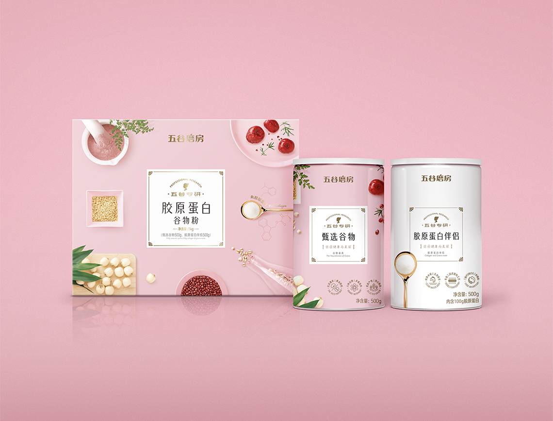 “五谷專研系列”主要針對年輕女性做的一款高端產(chǎn)品,畫面以粉色為主,襯托年輕女性對美的高度追求,同時原材料的視覺處理也表現(xiàn)極為精致,與產(chǎn)品本身定位高度契合。