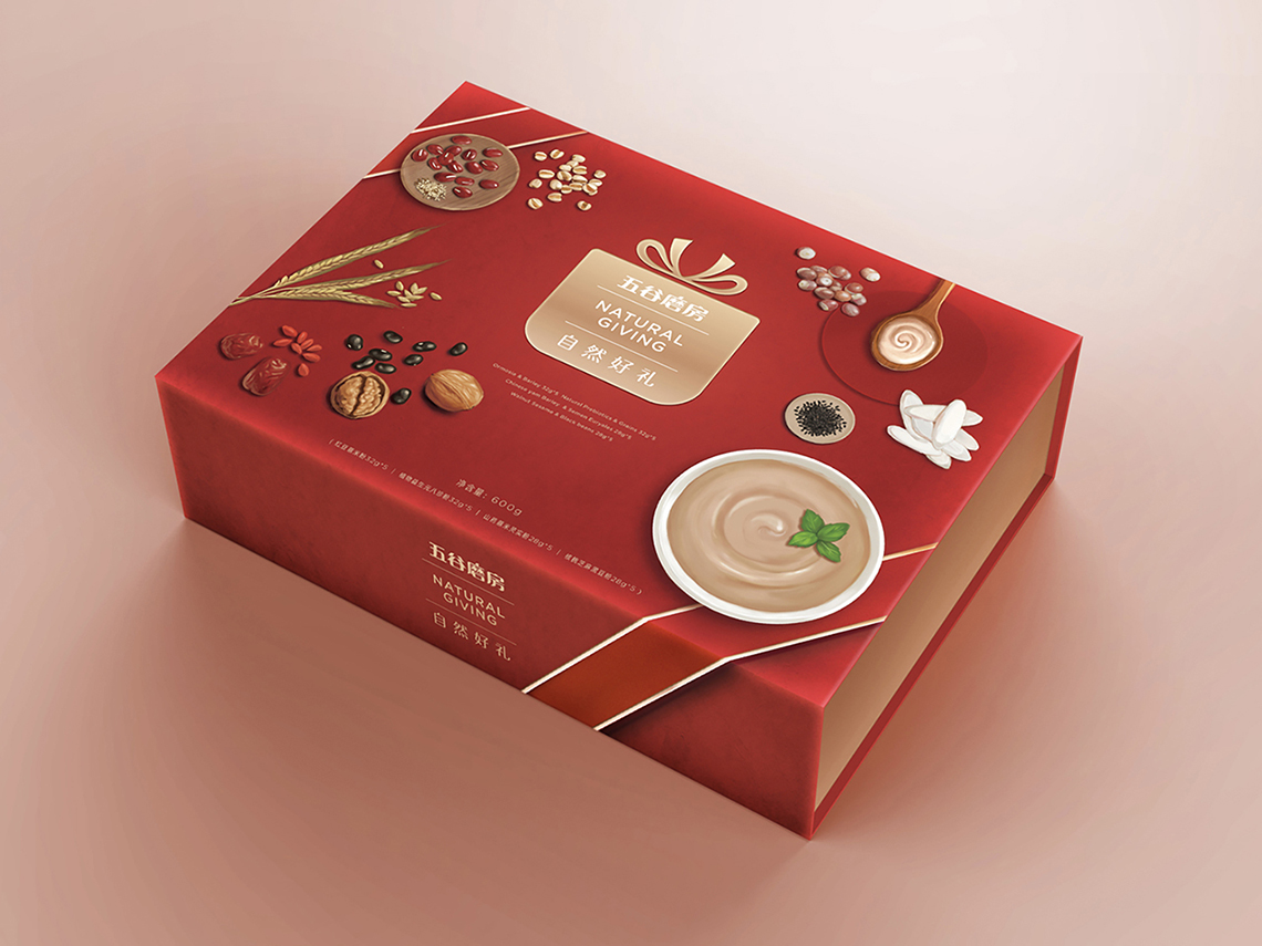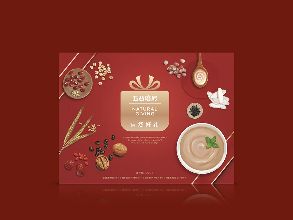 “春節(jié)禮盒裝”以迎合中國傳統(tǒng)春節(jié)氣氛而設(shè)計,整體畫面設(shè)計也以烘托原材料的健康天然為主,同時增加禮盒元素的設(shè)計,使其節(jié)日氛圍更為凸顯。