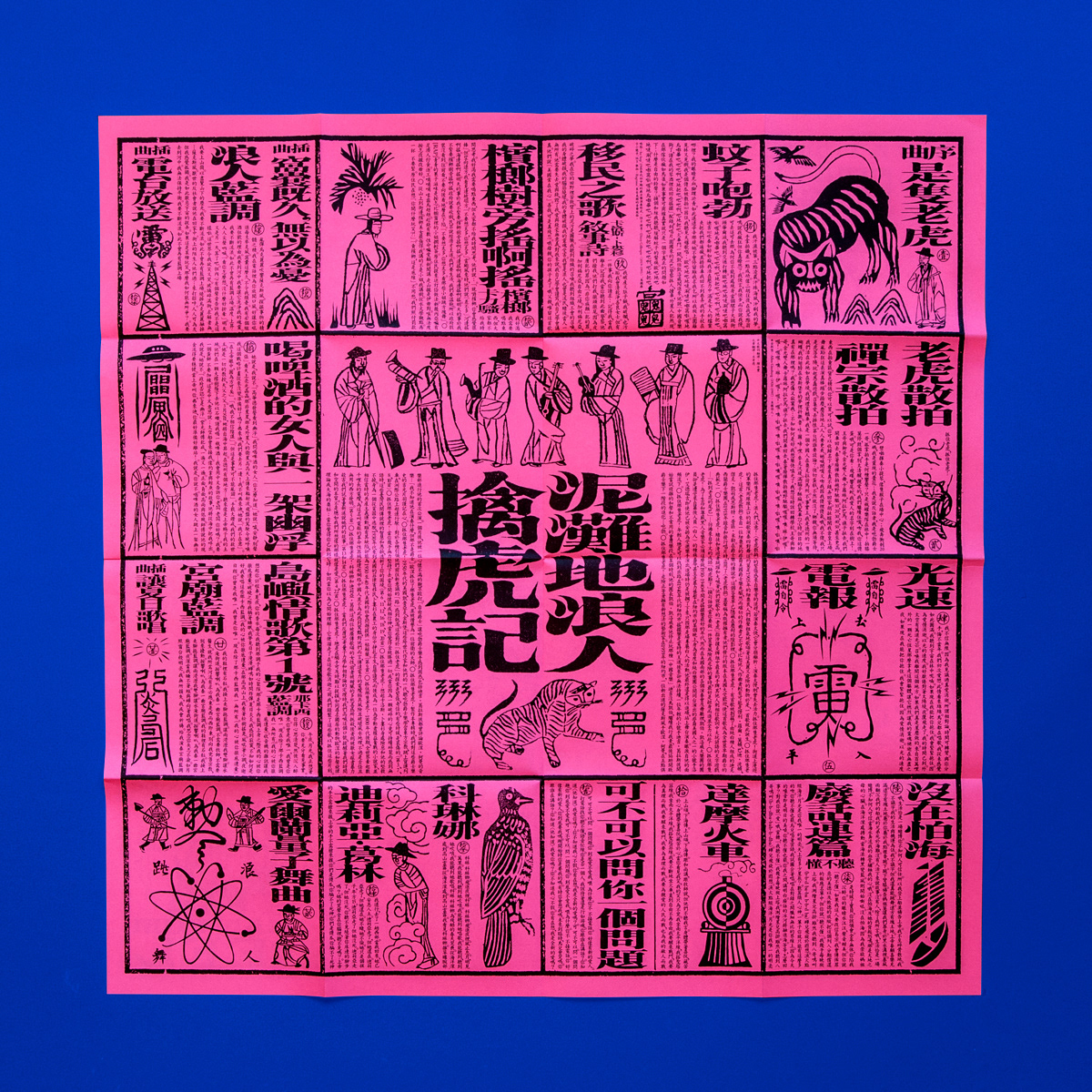 擒虎記,源自一首古老的爵士經(jīng)典《Tiger Rag 老虎散拍》,相傳由美國紐奧良非裔爵士樂手於1905所創(chuàng),1918卻被白人組成的爵士樂團(tuán),錄音發(fā)行並剽竊了版權(quán)所有。藉樂史事件切題發(fā)揮,視覺也悄悄地「剽竊」了民俗信仰中的文化元素,專輯中的所有物件,彷彿廟宇中發(fā)予信眾的勸世刊物,仔細(xì)窺探卻發(fā)現(xiàn)事實(shí)並非如此單純。