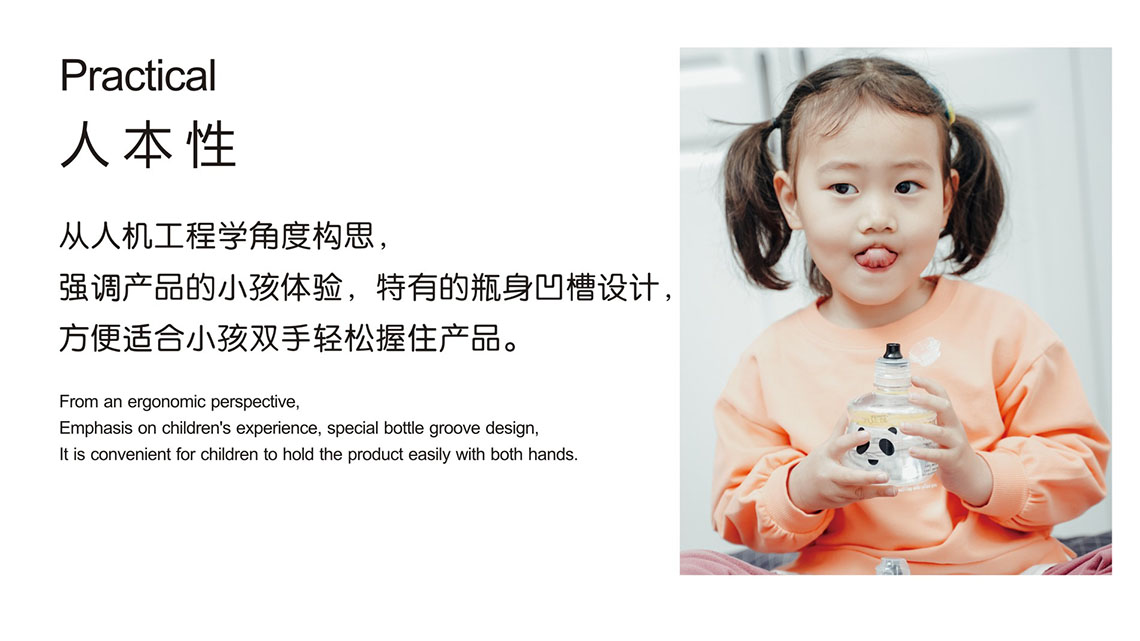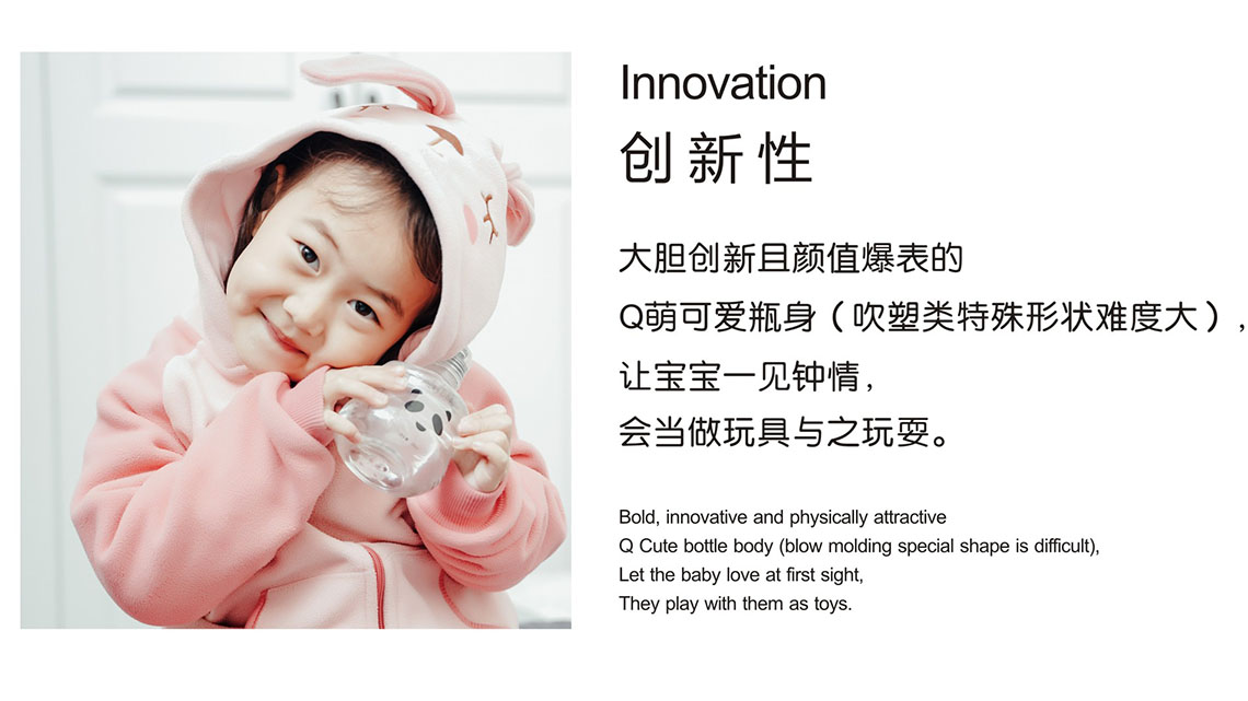 我們打破常規(guī),前所未有,大膽創(chuàng)新且顏值爆表的Q萌可愛瓶身讓寶寶一見鐘情,會當做玩具與之玩耍。