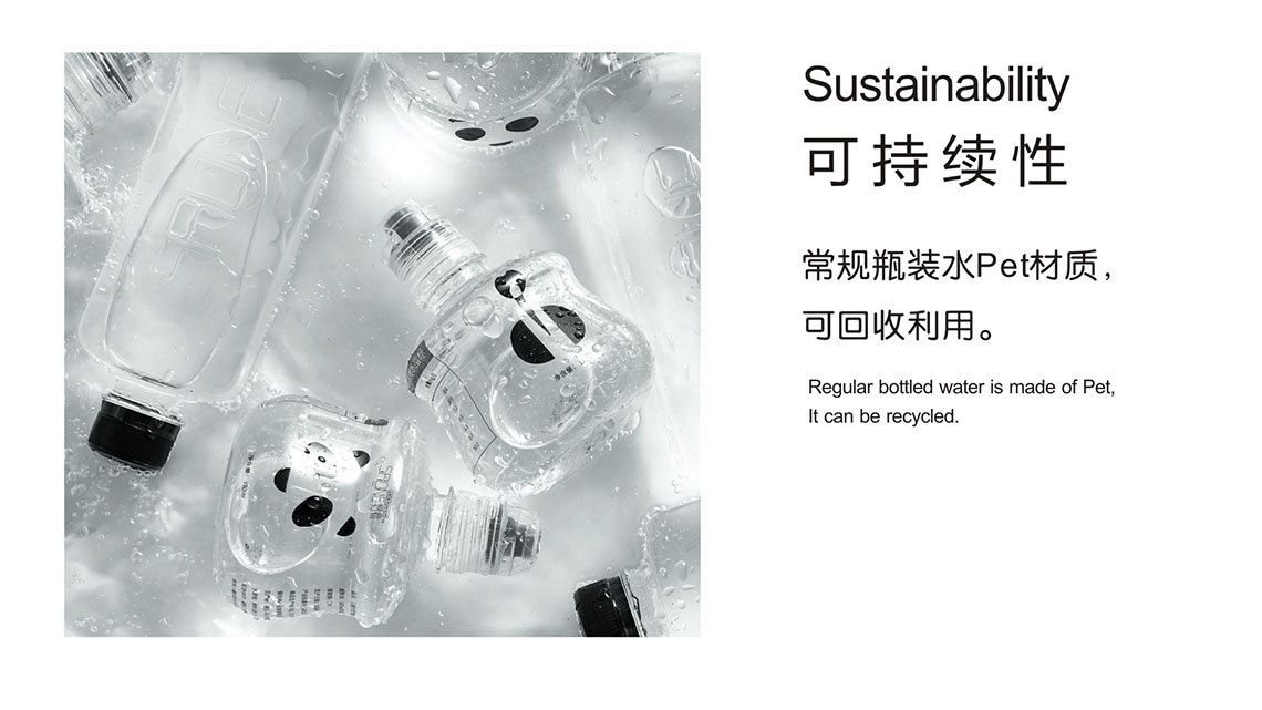 同時瓶身主體以簡約可愛的“秦嶺(水源地)四寶”——大熊貓、朱鹮、金絲猴和羚牛這四種動物作為主圖案,