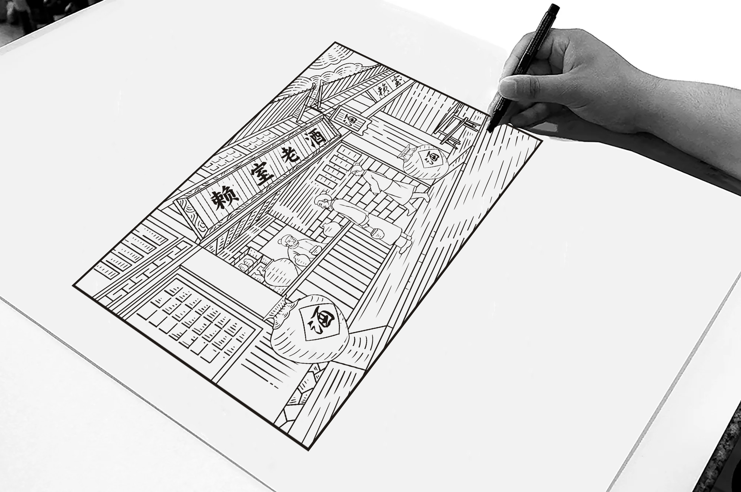 賴室老酒需要將百年老店形象呈現(xiàn)給顧客。手繪的賴室老酒酒坊,還原了賴室老酒的真實(shí)歷史。